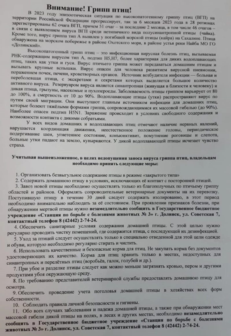 Обеспечение выполнений мероприятий, направленных на ликвидацию очага высокопатогенного гриппа птиц возложено на Агентство ветеринарии и племенного животноводства Сахалинской области.