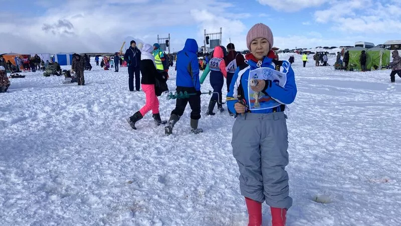 Биатлонистка как раз успевает поменять наживку и вытаскивает навагу.