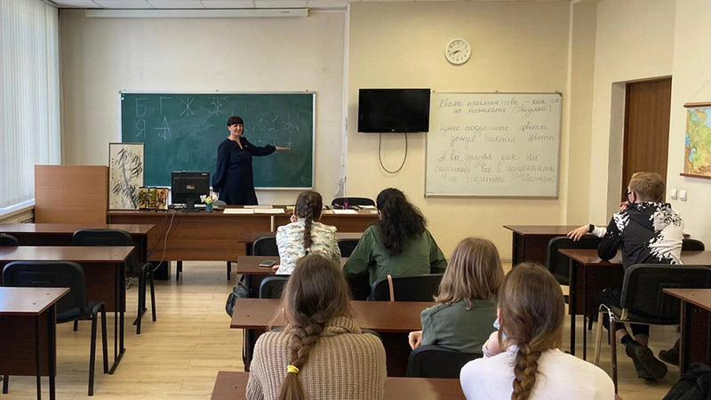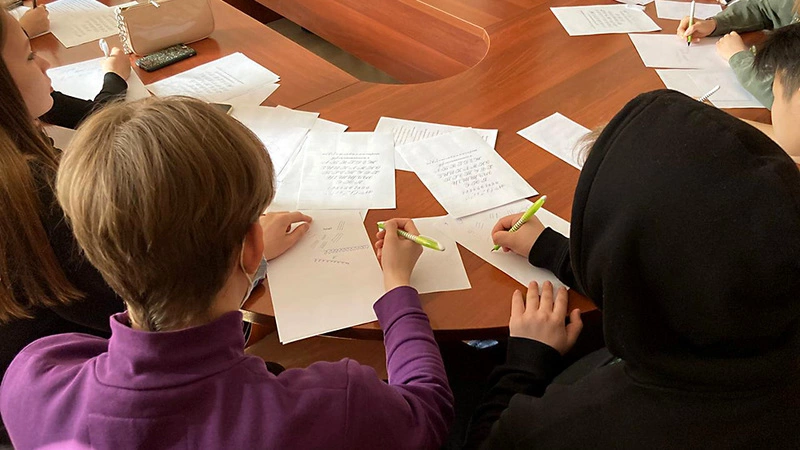Получив порцию теории, школьники выбирают крыловские цитаты и пробуют переписать их перьевой ручкой. Образцы написания букв лежат на столе. Пока ребята упражняются, студентка Елизавета Мальцева читает им доклад о художнице Надежде Рушевой.