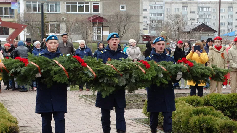 Празднование 76-й годовщины Победы в Великой Отечественной войне в Долинске началось с торжественного мероприятия в сквере Славы.