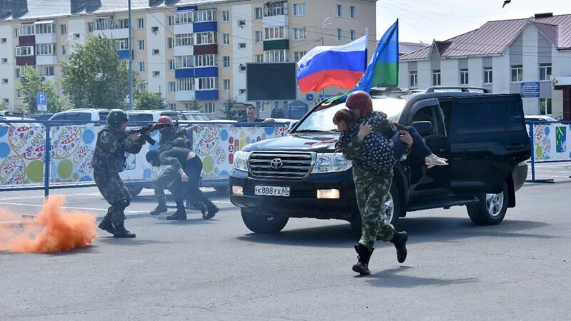 Десантирование и освобождение заложника из движущегося авто, приемы рукопашного боя, элементы строевой подготовки, выставка стрелкового оружия – автопробег-экспедиция по местам боевой славы, посвященная 80-й годовщине начала Великой Отечественной войны, прибыла в Долинский район.