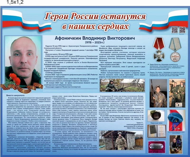К этому дню Галина Чуева и одноклассник Владимира Александр Коркуц подготовили фотопрезентации. На снимках – В. Афоничкин с друзьями, в кругу семьи, на отдыхе, в зоне СВО… Красивый, молодой, улыбающийся… Фоторяд сопровождается пронзительной песней «Встанем» в исполнении Шамана. Презентации может посмотреть каждый. Для этого на мемориальной доске размещены QR-коды.