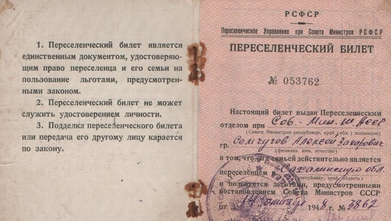 История нашей страны запечатлена в судьбах людей. Я держу в руках переселенческий билет за номером 053762. Он выдан Семчугову Алексею Захаровичу, прибывшему в село Покровка Долинского района Сахалинской области в 1950 году из Татарской АССР. В документ вписана Семчугова К. Е., супруга, и пятеро их детей. В переселенческом билете указана сумма единовременного денежного пособия в размере 3310 рублей – немало по тем временам – правительство давало новосёлам возможность обустроиться на новом месте и найти работу. Однако не все приезжали на остров по переселению. Последняя публикация этого цикла посвящена семьям Копыловых, Пугачевых, братьев Стельмах.