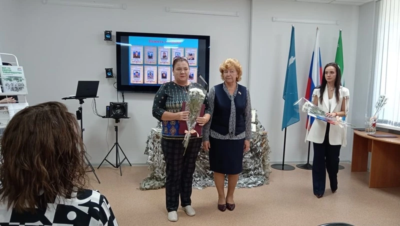 Жанна Протасова поблагодарила сотрудников библиотеки за нужное дело по сохранению памяти об участниках СВО и вручила цветы Ирине Жуковской, заместителю директора ЦБС. Ирина Леонидовна не только возглавляет редакционный совет по выпуску изданий, но сама составила 45 буклетов. Всего же их выпущено уже 56. Они размещены на сайте Долинской ЦБС, любой желающий может с ними познакомиться.