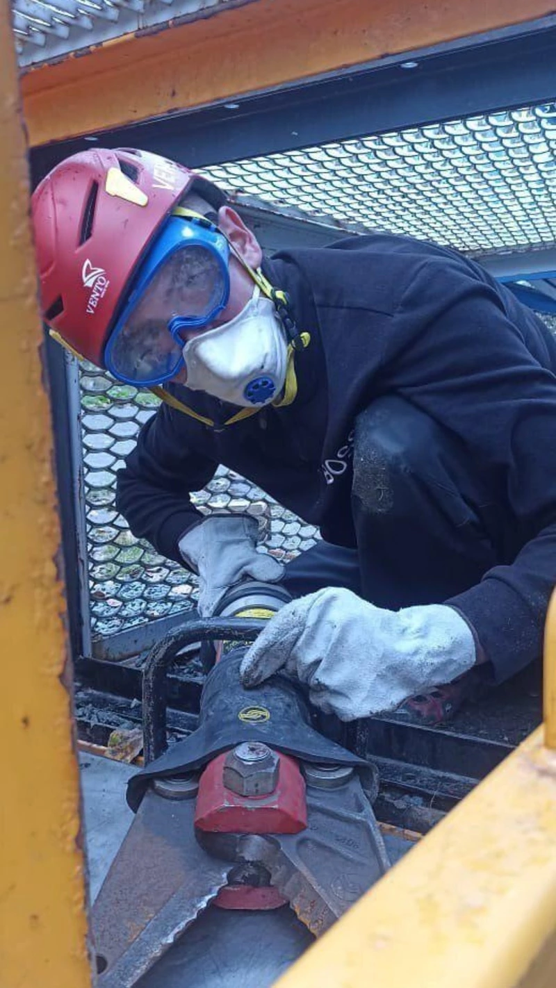 После этого команда делилась на два звена. Одни шли в лабиринт, имитирующий завалы, где при помощи гидравлического инструмента необходимо было освободить пострадавшего, не травмировав его. Другие отрабатывали действия газодымозащитников: в полной экипировке, с дыхательными аппаратами, они преодолевали помещение, заполненное густым дымом, и оказывали первую помощь пострадавшим – одному с кровотечением, другому с синдромом длительного сдавливания.
