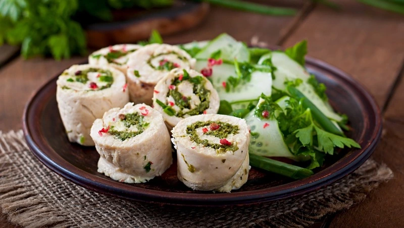 Индейка — диетическое мясо, которое прекрасно впишется в новогоднее меню. Для этого блюда вам понадобятся тонкие ломтики филе, которые можно начинить овощами, обжаренными на минимальном количестве масла. Такие рулетики запекаются в духовке и подаются с лёгким соусом на основе натурального йогурта.