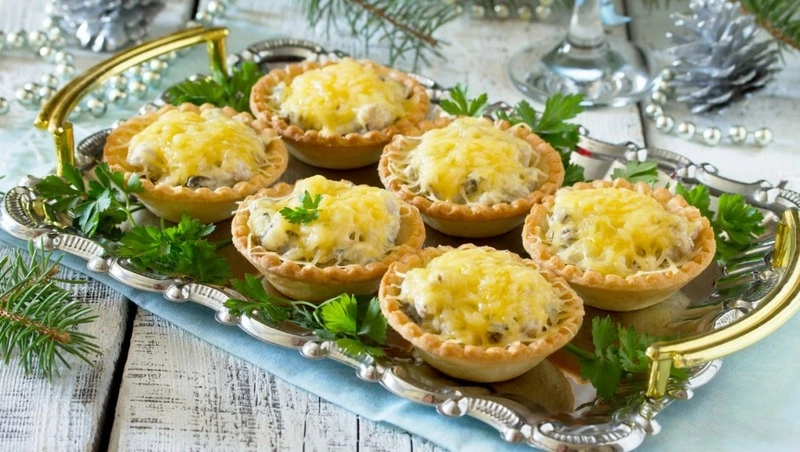 Отварите куриное филе и нарежьте его кубиками. Обжарьте нарезанные шампиньоны с луком до золотистой корочки. Смешайте куриное филе с грибами, добавьте майонез, посолите и поперчите. Наполните тарталетки полученной смесью и украсьте зеленью.
