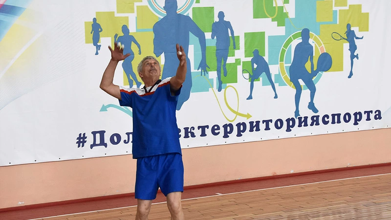 Вторыми на площадку вышли представители «серебряного» возраста – 50 человек под руководством тренеров-общественников Татьяны Макеевой и Татьяны Матвеевой. После кардиоразминки и растяжки они разделились на команды и состязались в товарищеском турнире по японскому волейболу.