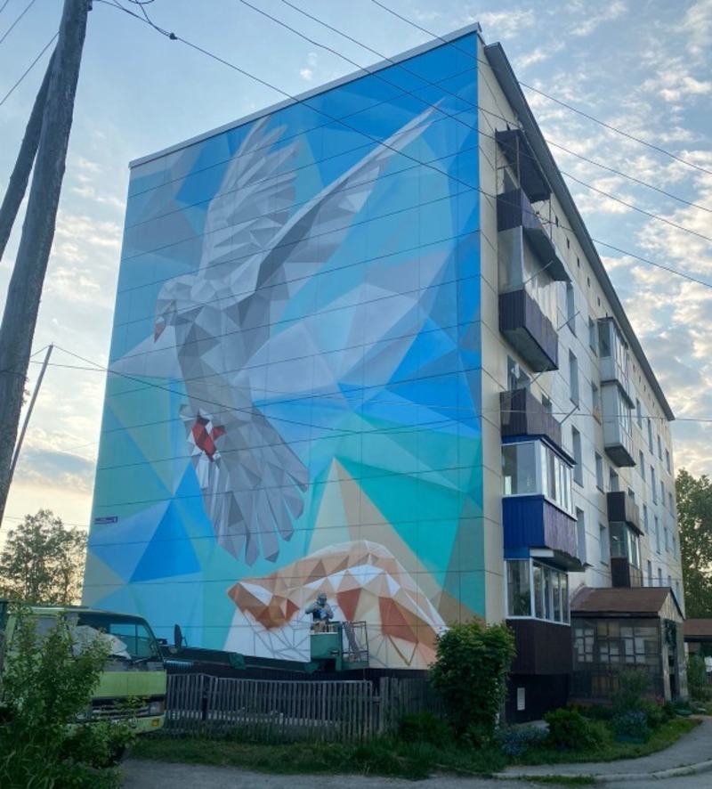 Над картиной работает один мастер с помощью автовышки. В нынешнем году это Александр Гущин из Екатеринбурга. Молодой человек окончил архитектурную академию и имеет довольно большой опыт по нанесению граффити на стены, в том числе в нашем районе. Он – автор композиции на подпорной стене у школы № 1 Долинска; изображения орлана, морского побережья, зеленых сопок, синего моря на фасадах жилых домов на углу улиц Комсомольская и Севастьянова, а теперь еще цветов и голубя.